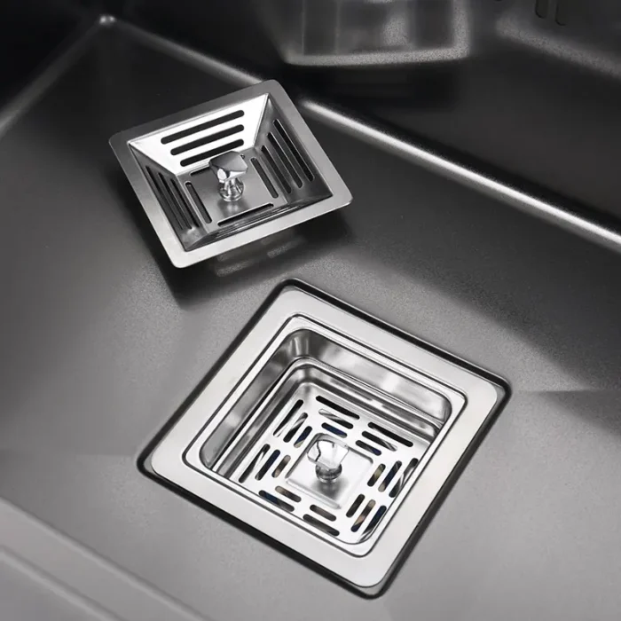 Incluye sopapas con tapón y canasto recolector Black-Nano, conectadas a un sifón HÄUSAR de PVC en forma de “V”, diseñado para evitar olores, atascos e ingreso de insectos. La sección transparente del sifón permite visualizar su estado antes del mantenimiento.