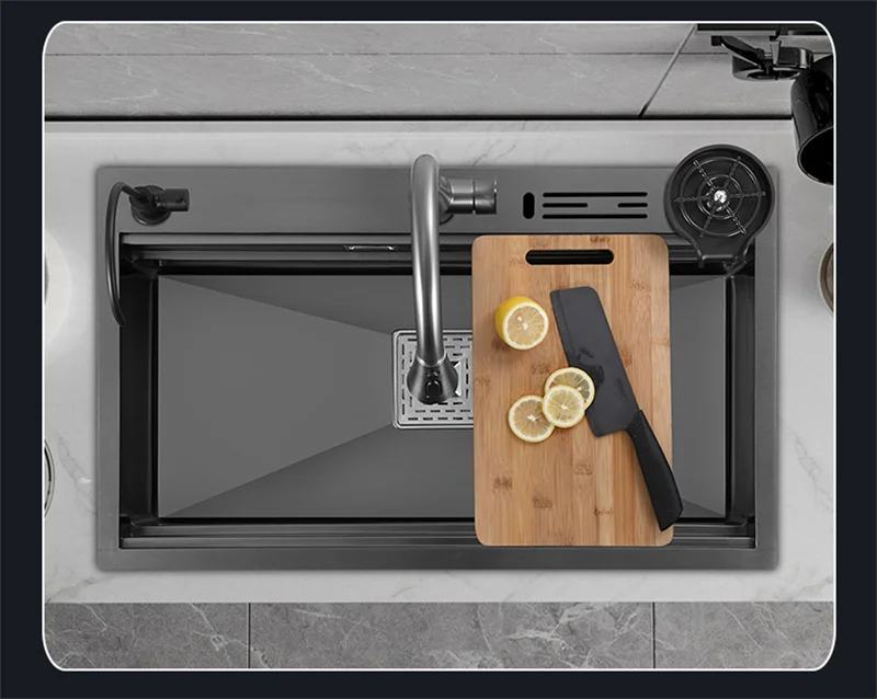 La doble cuba permite trabajar con mayor comodidad y eficiencia. El diseño interior de esquinas a 90° facilita la limpieza. Además, cuenta con orificio anti-rebalse integrado, es apta para la instalación de triturador y su colocación puede ser sobre-mesada o al ras. Se incluye también un dosificador en el mismo acabado Black-Nano.