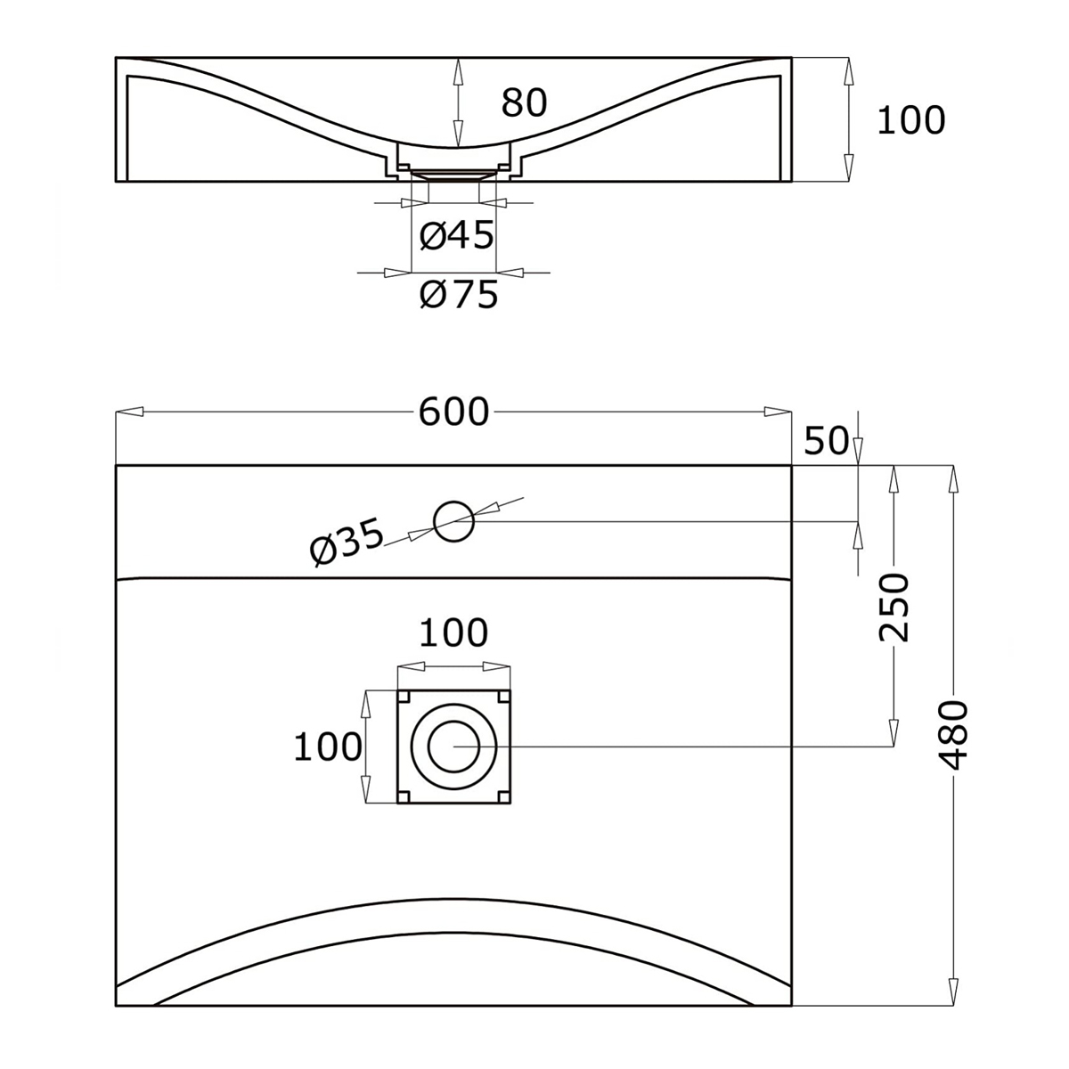 DIMENSIÓN PRODUCTO: Externas (600x480x100mm.). Orificio Desagote Ø45mm.