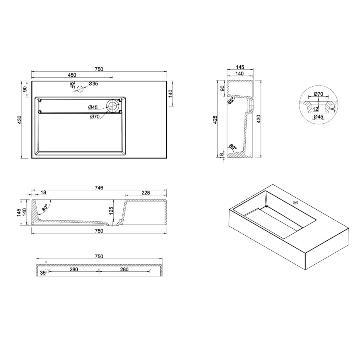 DIMENSIÓN PRODUCTO: Externas (750x425x140mm). Orificio Desagote Ø45mm.