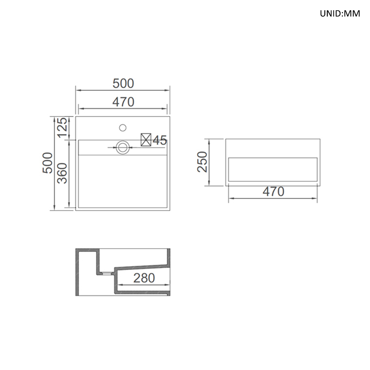 DIMENSIÓN PRODUCTO: Externas (500x500x225mm.). Orificio Desagote Ø45mm.