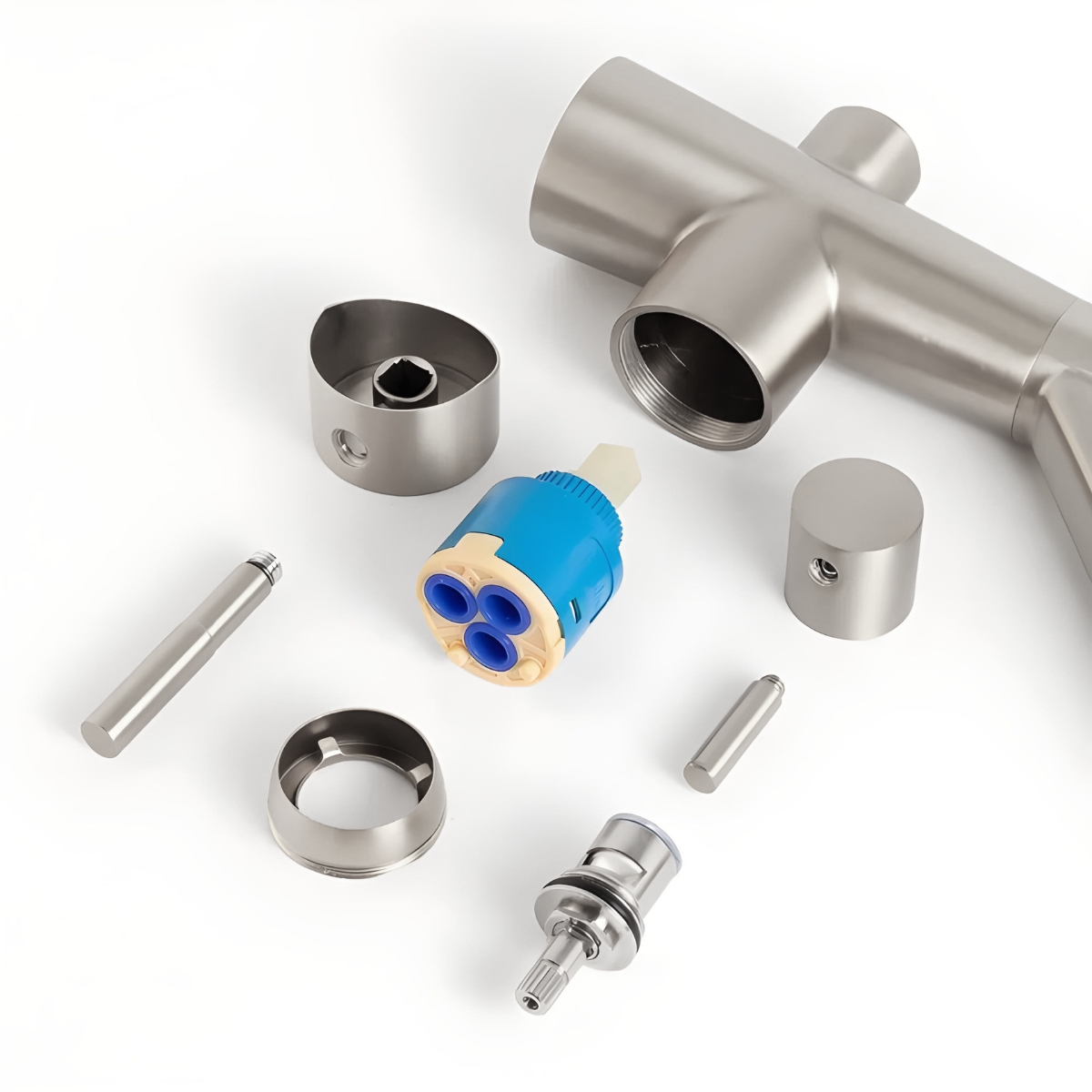 Construida con una combinación de latón, e íntegramente de bronce, esta grifería garantiza resistencia estructural, larga vida útil y una terminación de alto nivel.