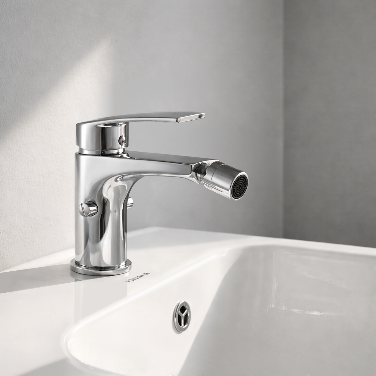 Fabricada 100% en bronce, con sistema monocomando y acabado cromado brillante, ofrece durabilidad, precisión y una estética sobria para cualquier baño contemporáneo.